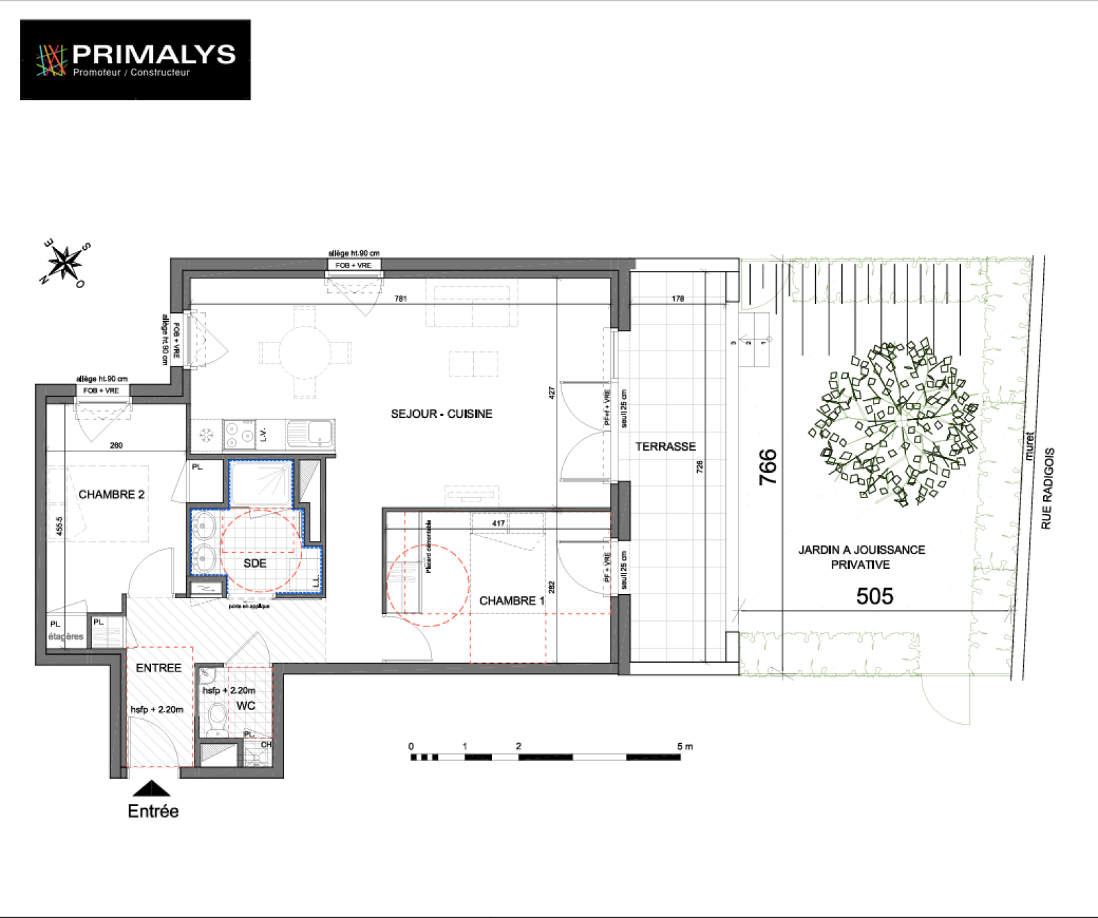 L’appartement se compose d’un séjour spacieux de 32,60 m² avec cuisine ouverte, bénéficiant d’une grande baie vitrée donnant accès à une terrasse de 12 m² et à un jardin privatif de 40,10 m², exposé Sud-Ouest.
